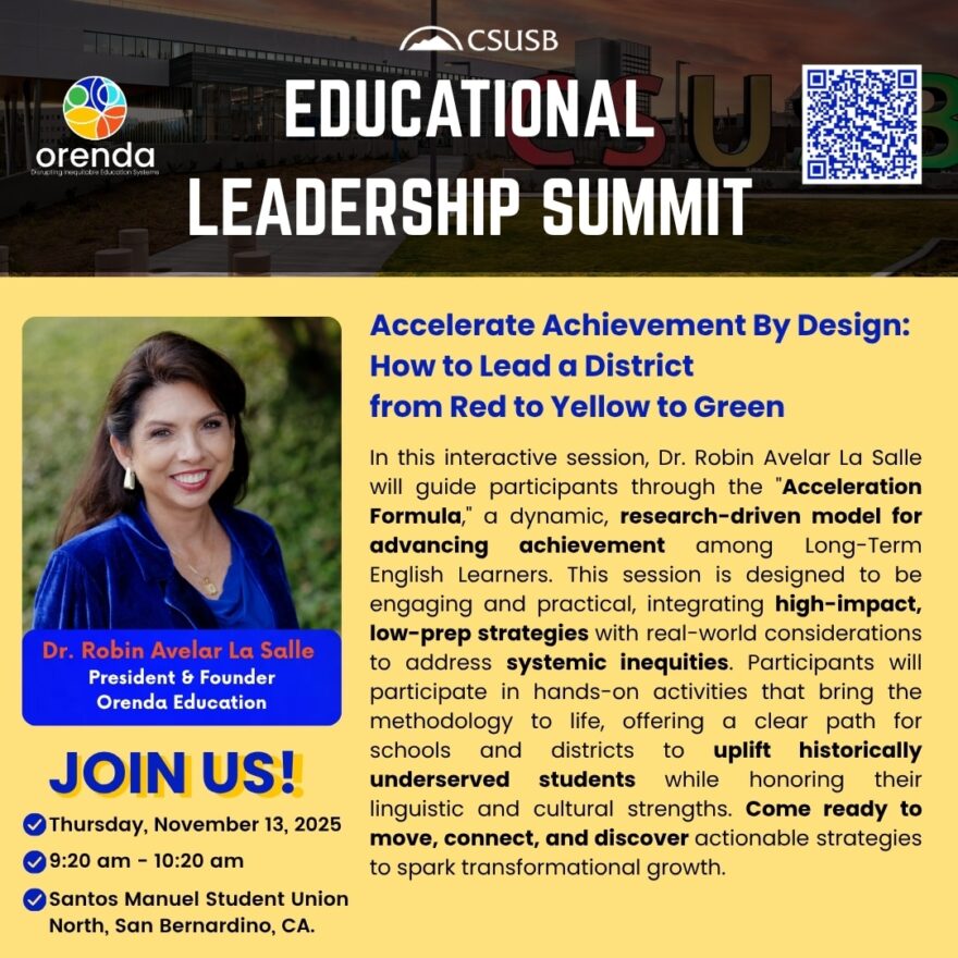 We are thrilled to share that Dr. Robin Avelar La Salle, President and Founder of Orenda Education, will be presenting at the CSUSB Educational Leadership Summit on Thursday, November 13, 2025, from 9:20 – 10:20 A.M.
