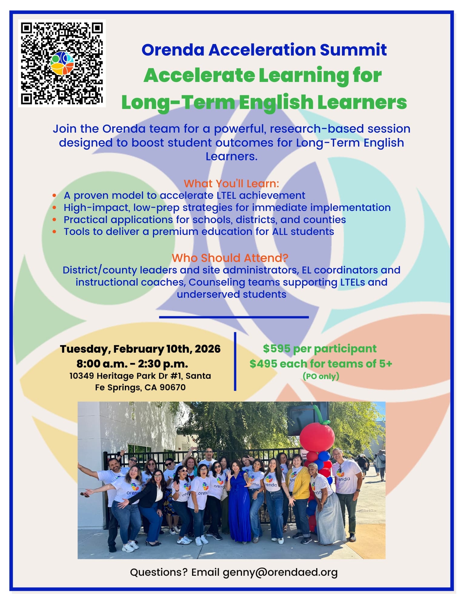 Join Dr. Robin Avelar La Salle and the Orenda Education team for a highly engaging, action-oriented session designed for teacher teams, teacher leaders, instructional coaches, and administrators who support Long-Term English Learners (LTELs). This session is perfect for anyone looking to deepen their instructional practice and for those who were unable to attend Part One.